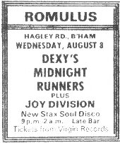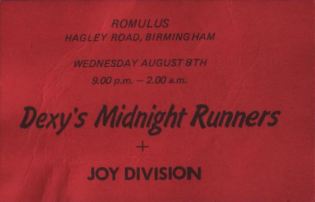 The first two relate to a gig Dexys played at Romulus on the Hagley Road. Ian has sent the ticket into the archive and an advert promoting the gig. In itself these are brilliant historical artefacts of early Dexys events. What really elevates them is the support band who played that night, Joy Division.